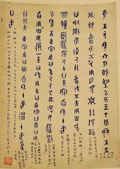 节临《秦公簋铭》,设色纸成扇,民国廿三年(1934年)作于青峰山寺。该书字体方正饬严谨,微曲中求劲健,表现出强悍雄风。