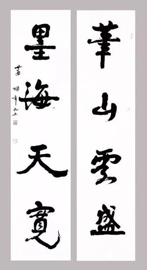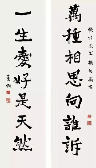 《白公张祐七言联》,书于1945年,庄闲时年七十有四。联语为“白公睡阁幽如画,张祐书碑妙入神”。款识:“乙酉夏日庄闲,时年七十有四”。钦印二方。该书隶楷兼收,力蕴千钧,端庄大度,为庄闲晚年精品之作。