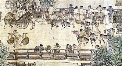 城门内头一家是税务所,门口有四个车夫运来一批装着纺织品的麻包,一个车夫进屋向税务官报税,税务官欲出具文字,门外的税务官指着麻包说出了一 个官家想要的数字,一定是因高出来的税额,引起车夫们的不满,一个车夫向他递交了一份货单,进行解释,另一个车夫急得大声嚷了起来,吵声之高,惊动了城楼 上的更夫向下张望。在徽宗朝大办漕运花石纲之时,税额激增,车夫与纳税者的纠纷,象征着当时紧张的官民关系,这完全是北宋的冗税制度激发了官民之间的对立 情绪。
