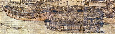 画中绘有十一条专事运输粮食的漕船,欣赏者都会被其严谨的绘画技艺与真实的生活气息所感染,而忽略在它们的背后深藏着严重的社会危机。北宋初 年,太祖限价售粮,太宗控制了南方后,更是力图通过漕运和仓储来掌控粮价。为了抵御荒年和逼退商贾的势力,北宋历朝均注重在汴河沿岸营建官仓。画中绘有两 处装卸工卸船的场景,船主们指挥着雇工队伍卸粮,粮食被装卸工转运到深巷的私仓里。要注意到:画中所有的粮船没有一条是官船,也没有一个督粮官到场监运, 这意味着朝政丢失了国粮储运的机会,画家真实地再现了当时的景况,诉诸了潜在的官粮危机。
