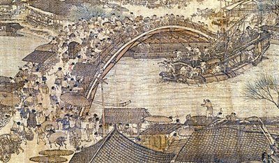 画中街道两边大量出现屋檐前加建的雨搭以及从平房伸展出来的遮阳棚和挡雨棚等辅助性建筑,或开设买卖,或摆摊设担,经过数次“得寸进尺”,构成 了北宋几朝都无法解决的“侵街”现象,造成交通拥挤、消防通道堵塞的痼疾,且愈演愈烈。商铺甚至云集到桥面上,堵塞桥面通行,造成险象环生的局面。城门口 亦拥堵不堪,无人管理,这些都是城市管理失控造成的。(图见看点三)