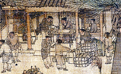 画中的“正店”是政府授权酿造美酒的酒店,“正店”右侧临街的屋子是供应军酒的地方,铺里有三个御林军士卒,他们奉命前来“正店”武力押送军 酒。他们在临行前例行检查武器,正中一位戴着护腕的汉子正在拉满弓试弦,他大概刚饮完了酒,浑身爆发出力量,显现出肌肉发达的体格;左侧一位正在系护腰, 右侧一位在缠护腕。这些本应该在城门口岗位上出现的军卒却精神抖擞地显身在酒铺里,绝妙的讽刺手法体现出画家对宋军弊病的批判精神。