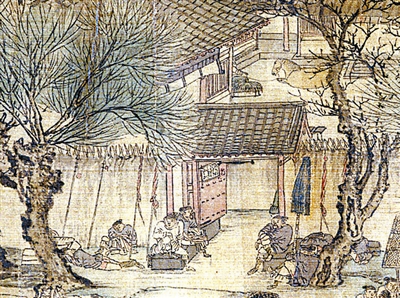 画家在城门外画有高等级的驿站,一座木桥与院门相连,门前坐卧着9个兵卒,还有两只公文箱,显然这是一队公差,像是在这里待命多时,已十分疲惫 了。院子里躺卧着一匹吃饱的白马,一个马夫手持缰绳,斜倚一侧,似乎在等待马的主人。应在清早出行的差役队伍,快到晌午,差官还迟迟不出,真实地表现了徽 宗朝拖沓低效的吏治局面。
