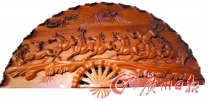 “八骏马”扇形木雕壁挂。
