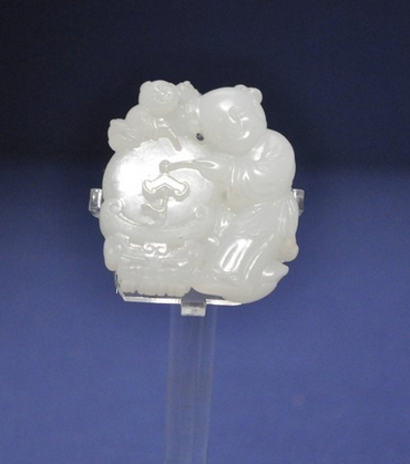 玉器中的人物造型及图纹发展到明清是极盛时期。虽然经科学发掘出土的资料不多,但宫廷旧藏和民间传世品却蔚为大观。这个时期人物雕像的制作数量,大 大地超过了以往。同时随着科技的发展,技巧越来越娴熟,工艺也越来越精细。在对人物的塑造上,多与当时盛行的“图必有意,意必吉祥”的社会风尚紧密结合。 福禄寿三星应运而生,一些玉佛象、玉观音、玉罗汉也不断出现,不过更多的还是天真活泼的儿童形象。明代圆雕童子,其身体肥胖,仅穿一花布肚兜,并作曲腿爬 伏状。双手持一莲茎,茎上端宽大的花叶则顺势搭在背上,从而使得造型浑然一体,宛如天成。此外童子的头部刻划得更为生动,那对称的双髻,圆圆的脸形以及小 眉、小眼、小嘴、突起的蒜头鼻和那满脸稚气的笑容,不但惹人喜爱,而且还透露出事种天生的福相。这就是作品隐寓的“连生贵子”的美好含义。清代人物作品, 继续沿袭了这种富有吉祥寓意的图纹和造型艺术。