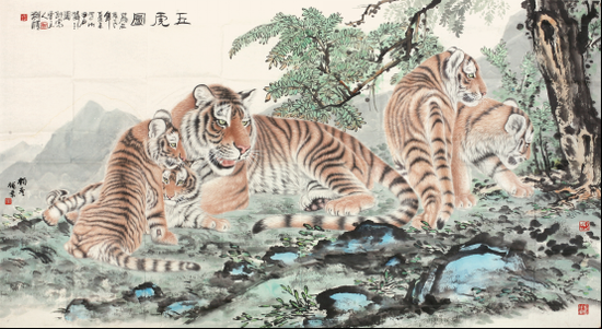 这幅《五虎图》描绘了在山林坡石中,一只成年虎带着四只幼虎拥卧在一起,神态各异,栩栩如生。孟祥顺尽精刻微的笔法如同丝绣发编,是以破锋笔细 丝而成,那柔韧蓬松的毛绒和美丽的斑纹,系留白所致,未施一点儿白粉,妙自天成。孟祥顺笔下的虎有骨、有肉、有神,皮毛彪炳斑斓,连毛色的光泽感也表现出 来了。工笔画画得精细易,画出学识难。孟祥顺