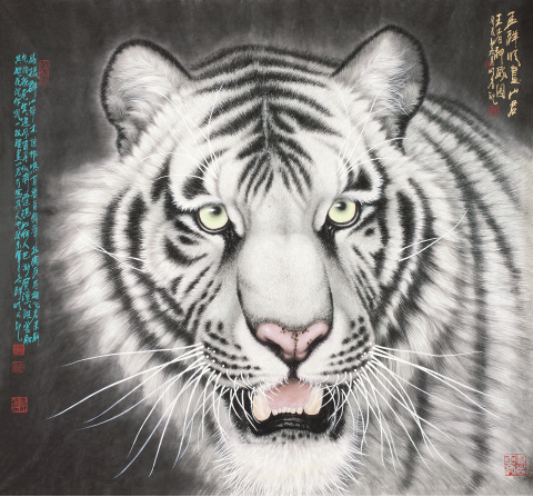 虎为百兽之王,自古以来备受人尊崇。孟祥顺擅画虎,他把虎静化、柔化,在静态的造型上和形体的转折中内涵着力。在威猛与柔静之间,在整体气势与 精谨表现之间体现着对立统一的辩证关系。孟祥顺把工笔画之工推向了极致,但感觉上却很超逸轻松,令人叹为观止。 且“虎”、“福”谐音,故古人以虎为福 ——《五虎图》有“五福临门”之寓意。