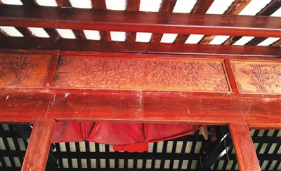 在花梨格木建造的高达五米的仿古庙宇拱顶上,上面 雕刻的木质花纹细致,雕工精美。不管是神龛前木刻的踏云而行衣着光鲜的神仙们,还是神龛壁前的神龙石 雕,无不充满民间神话色彩。特别是正堂前龙像的绘制与雕刻,王科美并没有画草图,而是直接就在木板和墙壁上顺手凿刻而出——40多年的功底可见一斑。