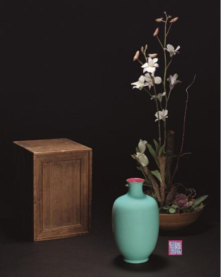 清:豆青釉胭脂红描金瓶(拍品编号:1118)场次:一品雍斓——明清单色釉瓷器专场 起拍价¥150,000 高 19厘米 款识:大清乾隆年制