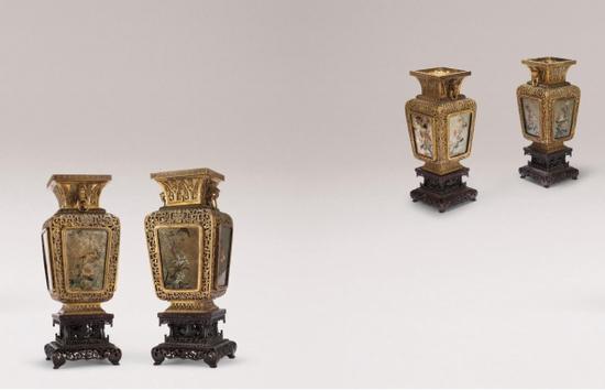 清乾隆:铜镂空开窗宫灯一对 (拍品编号:3090)场次:馨雅撷萃——明清杂项专场 起拍价¥500,000元,高 37.5厘米 原紫檀底座