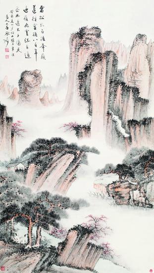 张大千(1899-1983) 苍松古道 (拍品编号:348) 起拍价¥3,500,000 纸本 立轴 癸酉(1933年)作 款识:苍松虬古植峰巅,莲径灵楼八百年。远岭飞云深百道,密林透出夕阳天。癸酉夏四月仿大涤子笔法,蜀人大千张爰。 钤印:大千无恙、张季印、大风堂 出版:《张大千精品集》P23,人民美术出版社,2011年。 144×81cm 约10.7平尺