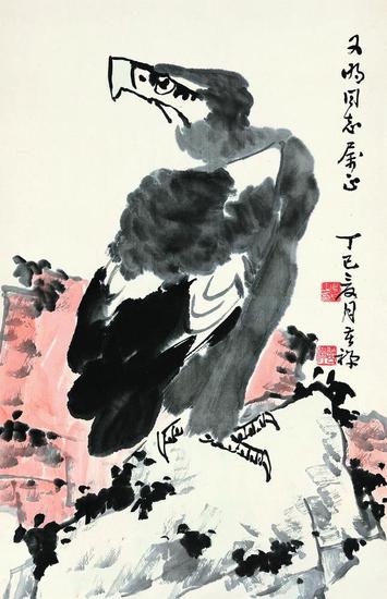 李苦禅(1899- 1983) 鹰石图(拍品编号:304) 起拍价¥350,000 纸本 立轴 丁巳(1977年)作 款识:又明同志属正,丁巳夏月苦禅。 钤印:李英之印、苦禅 68×45cm 约2.8平尺