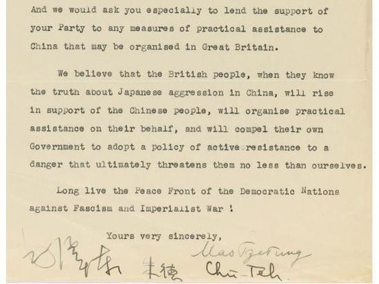 “我们想要代表中国向贵党寻求任何有可能来自英国的实际帮助,”信中写道,“我们相信,当英国人民了解日本在中国所犯下的恶行之后,就会选择和我们站 在一起,选择以你们的名义帮助中国人民,并选择督促你们的政府来防范这个很有可能给英国带来同等、甚至更残酷威胁的敌人。”