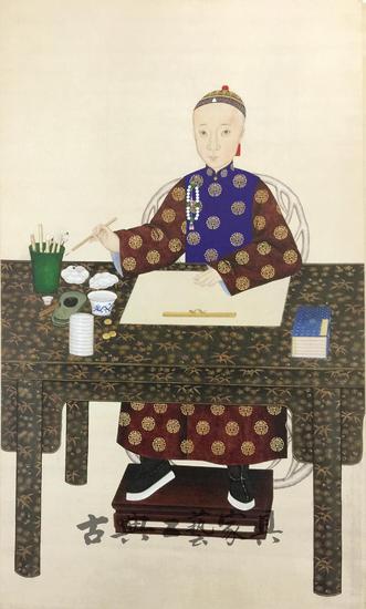图中年轻的同治帝身着便服,手持毛笔,伏案写字。画中的鹿角椅、黑漆描金桌、文房用具、红木脚踏等,反映了晚清宫廷的陈设。值得注意的是,同治帝右肩下挂着珍珠手串,手串上还配有翠玉、碧玺。