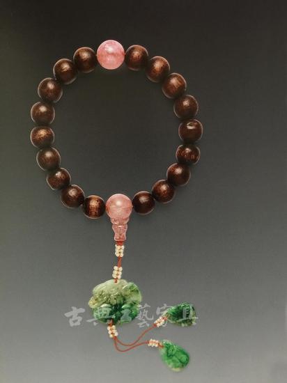 清宫旧藏。手串是由十八颗球状的伽南香木及碧玺结珠、佛头,翠雕背云、坠角串成,并装饰有米珠。伽南香亦称沉香,是一种既可散发香气又可药用的香木,多用来做成各种佩饰,可散发出淡淡的幽香。