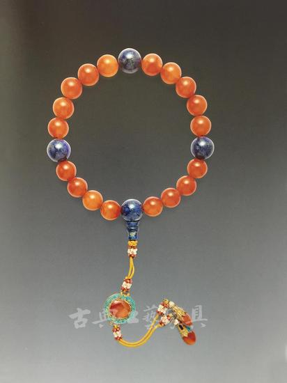 长31cm,手串直径12cm,清宫旧藏。手串共红玛瑙十八颗,青金石结珠三颗。青金石佛头及佛头塔装饰以珊瑚珠与米珠。背云为点翠椭圆牌,中央镶 嵌椭圆形红玛瑙一块,其下装饰珊瑚珠与米珠。坠角为镀金钟形嵌件,嵌镶红玛瑙两颗,其上装饰小珍珠一粒,也体现了匠师们高超的工艺水平。