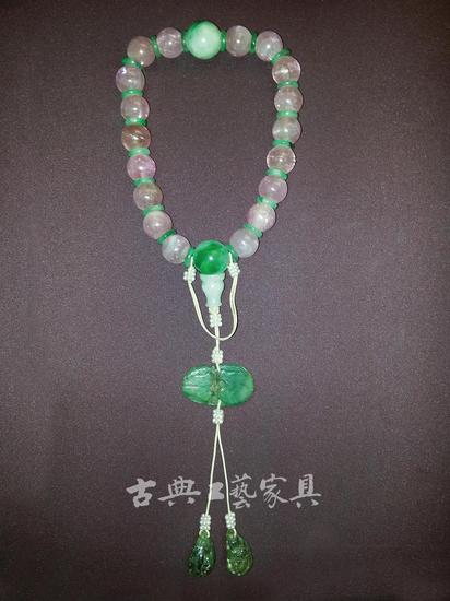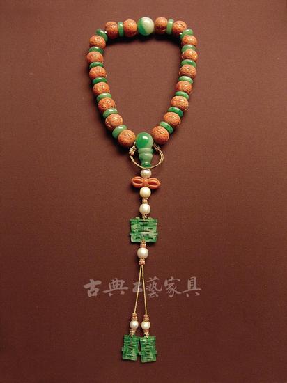 一般而言,清代女子佩带手串,穿对襟衣时,挂在第二颗纽扣上;穿大褂衣时,则挂在腋上方的襟钮上,也可挽在手腕或握于手中。玉石质地的手串多由 翡翠、红宝石、水晶等制成圆珠,选一精致的坠角系在上端,戴在衣襟扣上。手串与坠角呈下垂状。当然也有沉香、紫檀等珍贵木料质地,总体而言,根据服装颜色 选择合适、鲜明的手串佩戴,既增加美感,又体现富贵。