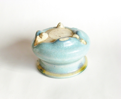 这只元代的钧瓷小香炉,玲珑精致,牙白色胎上满施天蓝色釉,自然流淌的釉水微垂于底部,口沿自然窑变的绿斑,使之略显俏皮,让人爱不释手。钧瓷 兴盛于宋金,中心窑厂位于河南禹州市。到了元代,各地窑厂竞相烧制。与宋代钧瓷整体釉面厚薄均匀的特征不同是,元钧釉面大多有垂釉现象,正是这种垂釉使元 钧看起来显得粗狂、奔放,这只鹤壁窑的钧瓷香炉造型简洁,釉面莹润、肥厚。口径7.5cm,高5.5cm,其制作精美,釉色清新,似在等待有美人添香。