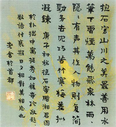 这首诗写于20世纪50年代那个“全民写诗”的特殊年代。内容并不重要,关键是这种形式的传承,诗本身又是那么有时代特色。大约也是在那个时 期,老舍收得清末画家姜筠一幅圆形小幅山水画,以及清末书法家吴春鸿写给颂庭的一幅小字。两幅作品都装裱成册页式的画片,留有很大的裱边。老舍“故伎重 演”,分别用毛笔在裱边上题词,评说这两幅作品,极俏皮,显示了典型的老舍式幽默。