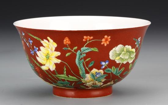 Lot 60 珊瑚红地粉彩九秋同庆碗 落槌价:17,000 美元