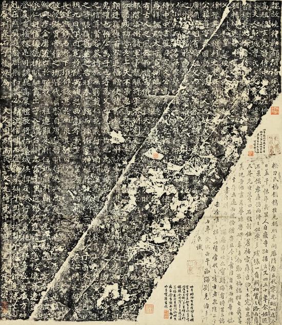 此拓二行“晋侍中尚书”之“晋”“书”二字、四行“曾祖彝”之“彝”、“晋侍中”之“晋”“侍”、六行“淑和”之“和”等字清晰,为嘉道间拓本。志 石於雍正间出河北南皮后,书法为世人所重,然其石质不佳,自行粉化,近拓较早期拓本风韵全无,此轴为较早拓本,不可多得。 鲍昌熙印、勿斋、田溶原、阳曲田氏考藏金石文字 1轴。