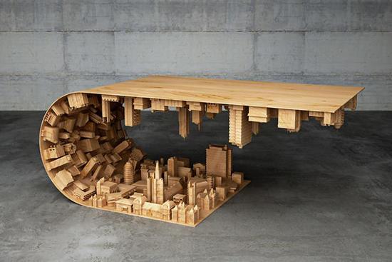 还记得电影《盗梦空间》中,造梦者创造出一层层既真实又虚幻的空间,老让我们搞不清楚现在到底在第几层,还是根本已经回到现实生活吗?大概只有在地面出现不合常理的波浪,景物出现不可思议的翻转、折迭和上下颠倒时,才会惊觉原来现在还在梦境之中。塞浦路斯设计师Stelios Mousarris以这样的概念设计出 Wave City咖啡桌,将布满摩天大楼和道路的城市翻折成曲面,一半是正常的城市景像,一半却是上下颠倒,两者之间存在著一条隐隐约约的界线,就好像现实与虚幻之间总是令人捉摸不清。