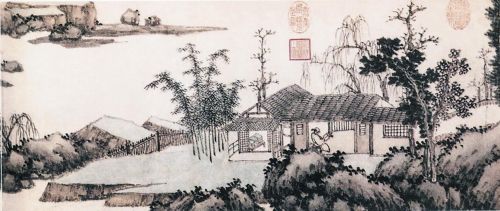 1963年,大连文物总店在庄河青堆子收集到从北京故宫流入民间的沈周名作《青园图》,现珍藏于大连旅顺博物馆。《青园图》,纸本,设色,纵 19.1厘米,横188.7厘米。此图描绘湖山秋色,结构严整均衡,局部富于穿插变化,使画面景物参差有致,一派清幽逸趣。在用笔上,该图多用秃笔中锋, 将勾、皴、擦、点有机配合,实中求虚。作者运用各种笔墨精心描绘了苏州青园的各种景色,画法工整,用笔圆厚,设色浓丽,山坡用甚密的披麻皴法以淡墨渲染; 用线圆劲,墨色浓润,富有生活气息,整个《青园图》,画得优美自然,从诗情、画意乃至哲理都耐人寻味。以水墨淡设色画古树茅堂依山傍水,修竹垂柳之中,一 人执卷堂上孜孜而读,周围宁静无波的湖水映带院落,三间茅堂和篱笆围墙参差有致,旁衬杂树新篁,景色平远而幽深。画心自题五言诗一首,署款“长州沈周”。 钤“启南”、“白石翁”印二方及清宫宝玺十余方。此图曾经被清宫内府庋藏,后流入民间。《秘殿珠林石渠宝笈续编》、《中国美术全集·明代绘画》、《中国绘 画全集》均有收录。