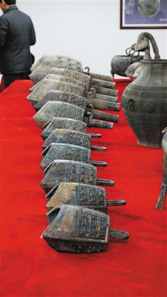 左为出土的青铜雁鱼灯,右为出土的铜编钟。