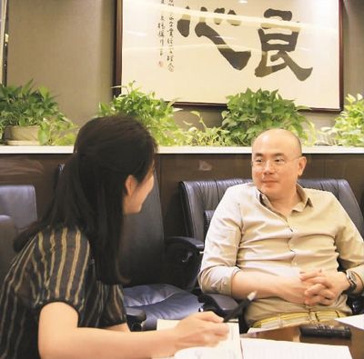 图为洪明基(右)接受本报记者采访