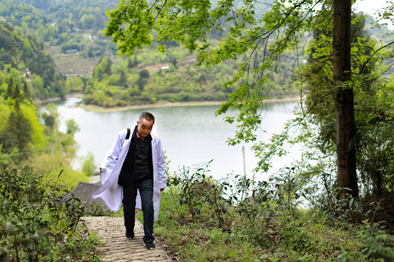 ▲雍元书医生走在出诊的山路上(4月12日摄)。