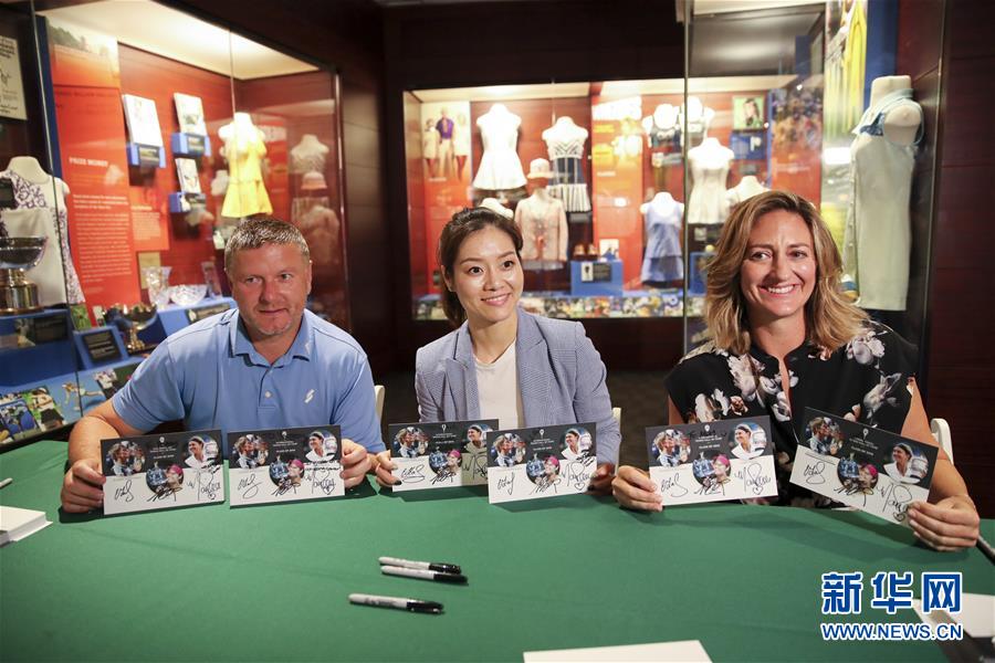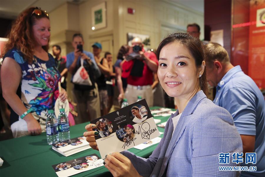 7月20日,李娜(右二)在国际网球名人堂与球迷互动。 新华社记者王迎摄