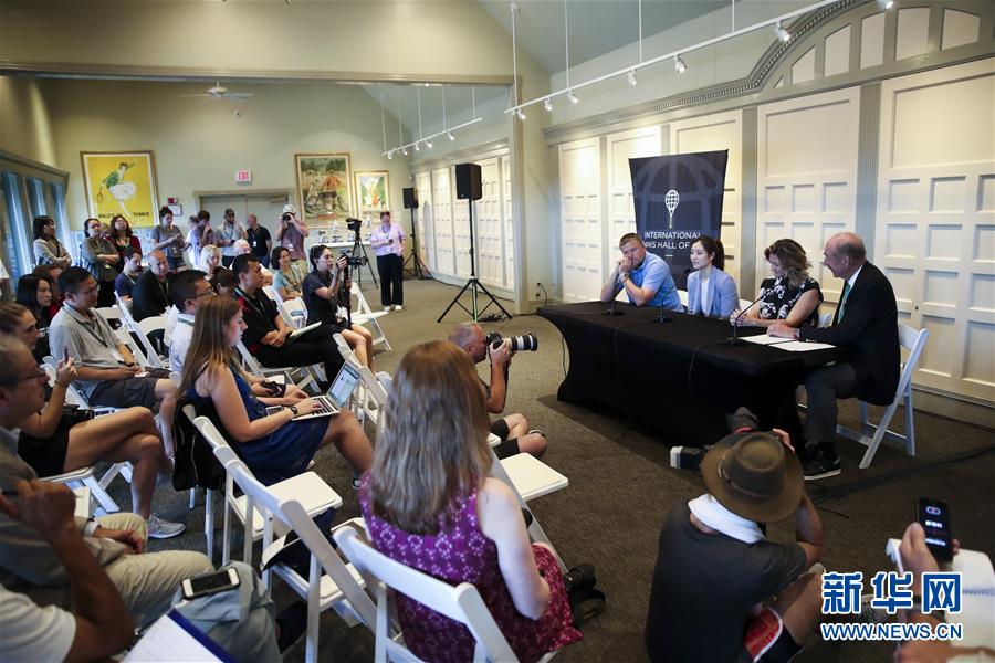 7月20日,李娜(左二)在国际网球名人堂举行的新闻发布会上回答记者提问。新华社记者王迎摄