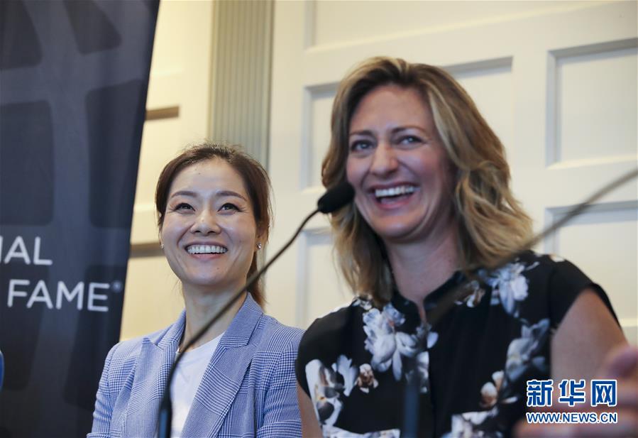 7月20日,李娜(右)在国际网球名人堂举行的新闻发布会上回答记者提问。新华社记者王迎摄