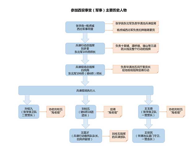 让我们通过“兵谏”指挥系统图示先认识一下参加西安事变的主要的历史人物: