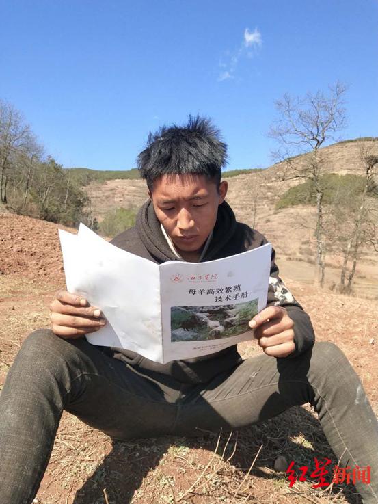 ↑合洛村村民正在看母羊繁殖技术手册。
