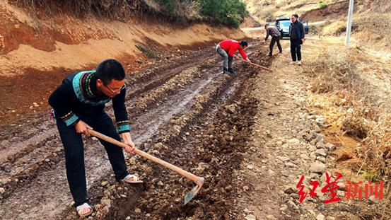 ↑李明带领帮扶队员一起修路。
