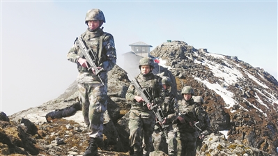 西藏军区某边防团詹娘舍哨所官兵在边防线上巡逻,以军人特有的方式庆祝节日。陈子昊摄