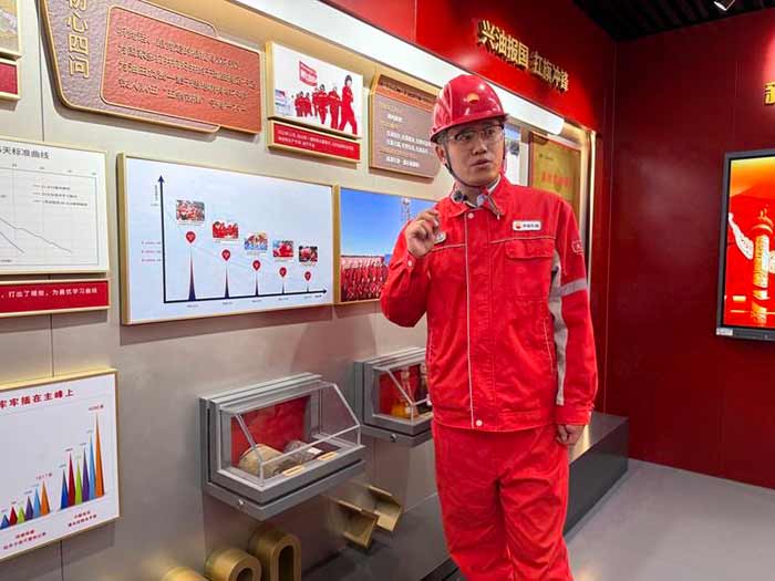 1205钻井队队长段永坚在队史室内介绍队伍发展历程。新华每日电讯记者孙晓宇 摄