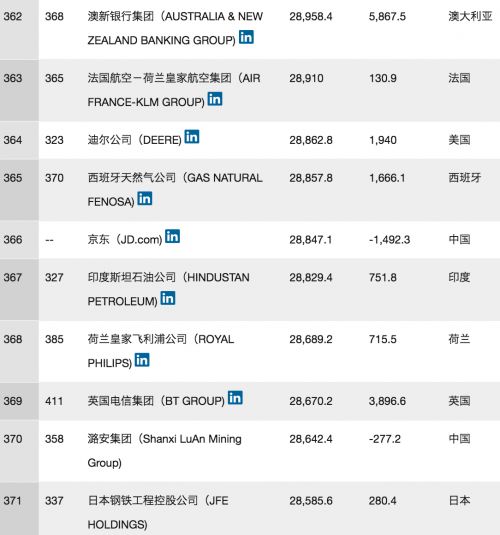 其中,京东以288.47亿美元的营业额、-14.92亿美元的利润位列第366位,成为中国首家且唯一入选财富500强的互联网企业。