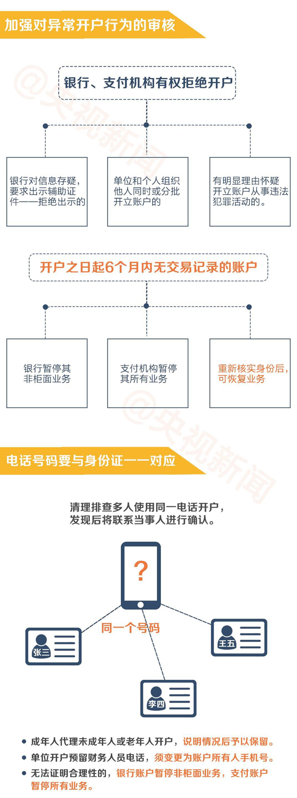 在央行出台的新规中,还规定对开户之日起6个月内无交易记录的账户,银行应当暂停非柜面业务,支付机构应当暂停所有业务,待单位和个人重新向银行和支付机构核实身份后,方可恢复业务。