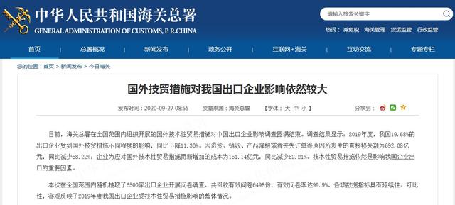 调查结果显示:2019年度,我国19.68%的出口企业受到国外技贸措施不同程度的影响,同比下降11.30%。因退货、销毁、产品降级或者丧失订单等原因所发生的直接损失额为692.08亿元,同比减少68.22%;企业为应对国外技术性贸易措施而新增加的成本为161.14亿元,同比减少62.21%。技术性贸易措施依然是影响我国企业出口的重要因素。