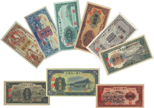 第一套人民币自1948年12月1日开始发行,共12种面额62种版别,其中1元券2种、5元券4种、10元券4种、20元券7种、50元券7种、100元券10种、200元券5种、500元券6种、1000元券6种、5000元券5种、10000券4种、50000元券2种(1949年发行的正面万寿山图景100元券和正面列车图景50元券各有两种版别)。