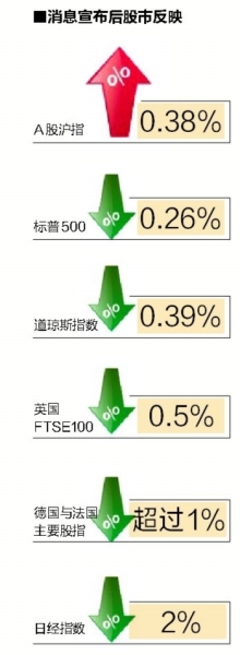 在声明发布到美股收盘的2个小时里,美股的指数上演过山车,最终标普500指数收跌0.26%至1990.20点;道琼斯指数下跌0.39%至16674.74点。同时,欧洲股市也在早盘时普遍下跌,英国FTSE 100指数开盘下跌0.5%,德国与法国的主要股指也在早盘下跌超过1%。