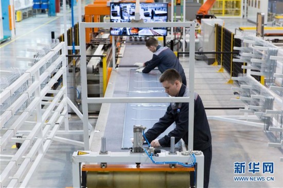 4月22日,在俄罗斯卡马河畔切尔尼市,工人在流水线作业。新华社记者白雪骐摄