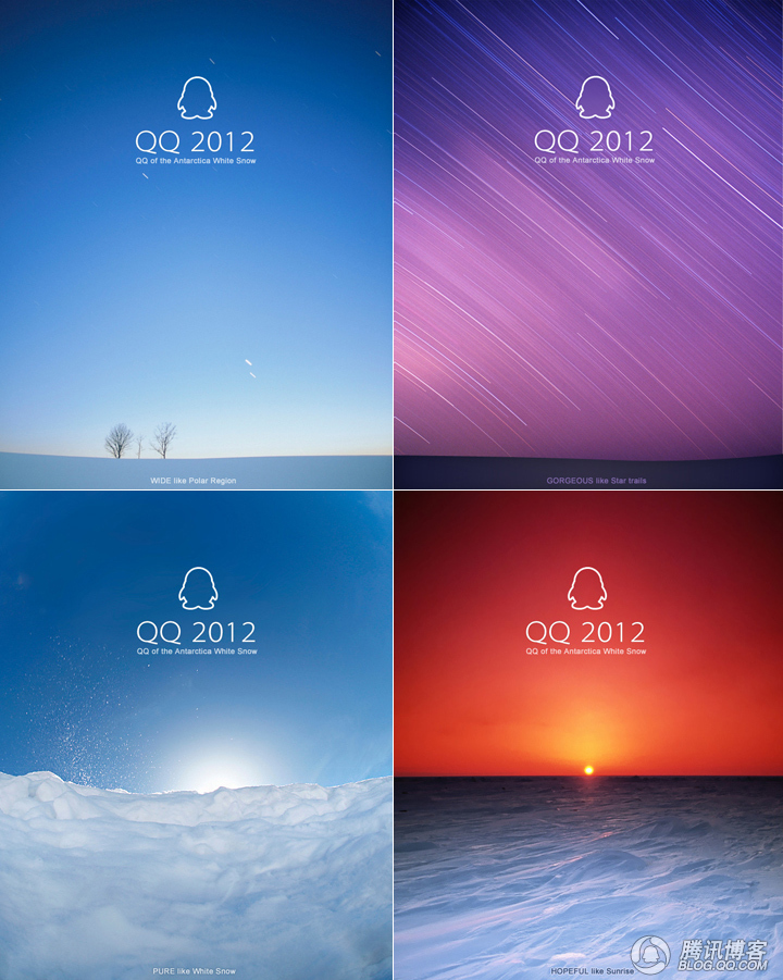 现在我们看到的企鹅LOGO,做得更干净、更剪影化。“我们用了很多极地的照片去烘托QQ的纯粹,而剪影就显得非常干净。”为了破除得冰冷的感觉,极地在不同的场景也有不同的感觉,比如夜晚星空、极光、早晨。