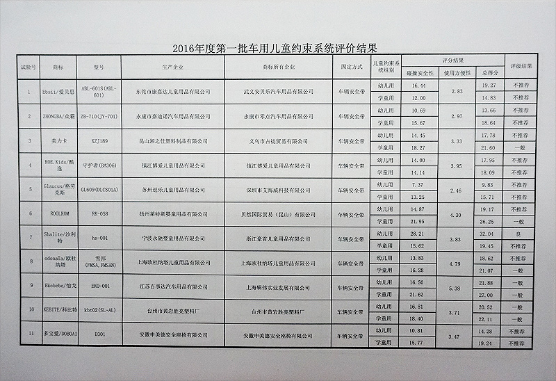 儿童安全座椅质量亟待提高。有的产品在设计上已将高等级评价作为目标,提高了对安全性能的重视程度,在产品各方面进行了积极改进,获得满意的评价结果。也有的产品未能获得很好的评价,对产品技术水平和安全要求有待进一步增加认识和了解。
