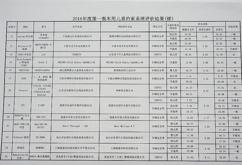车用儿童安全座椅评价结果发布