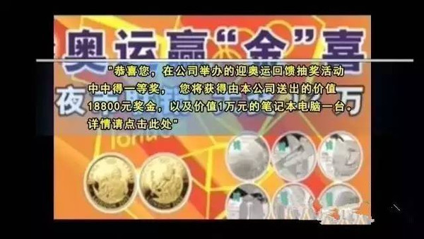 “恭喜您,在某某公司举办的迎奥运回馈抽奖活动中中得一等奖,您将获得由本公司送出的价值18800元奖金,以及价值1万元的笔记本电脑一台。详情请点击……”奥运刚开幕,很多市民在浏览网页或者网络聊天时,都会“幸运”地收到这样的“中奖”信息,这实则为典型的网络诈骗行为。