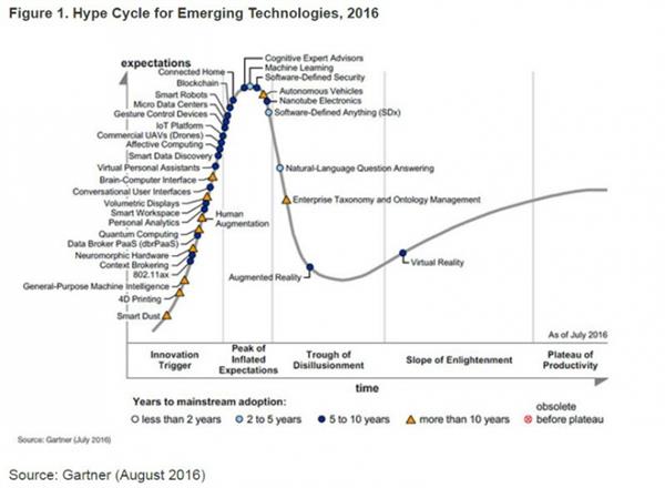 这两篇文章都强调了深度学习相对机器学习是有颠覆性的意义的。当然,深度学习在商用领域也具备同样的颠覆性。但是让人震惊和困惑的是,就连Gartner也没能分清机器学习和深度学习之间的差别。这里是Gartner于2016年8月份发布的发展规律周期图(Hyper Cycle),深度学习甚至没有被提及: