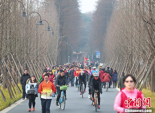 1月1日,大批市民在东湖绿道休闲游玩。 中新社记者 张畅 摄